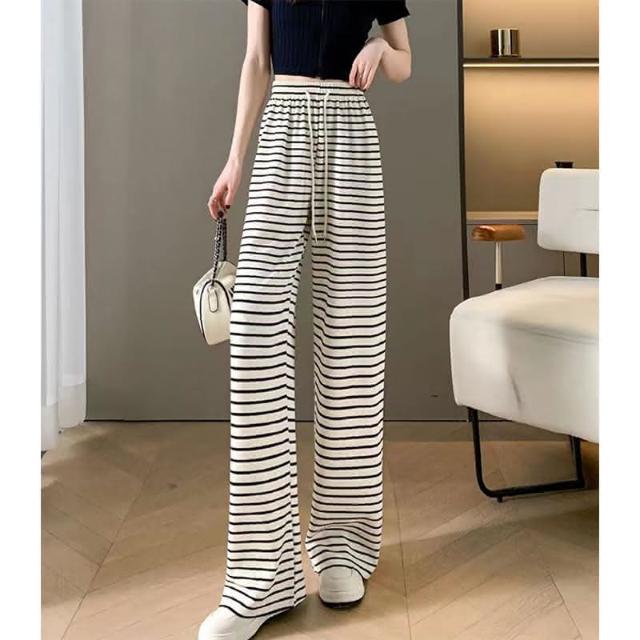 JDUDS黑白條紋闊腿褲 垂感溜灣褲 慵懶風格落地褲 黑白條紋長褲 黑白條紋寬鬆褲 綁繩褲 女生長褲