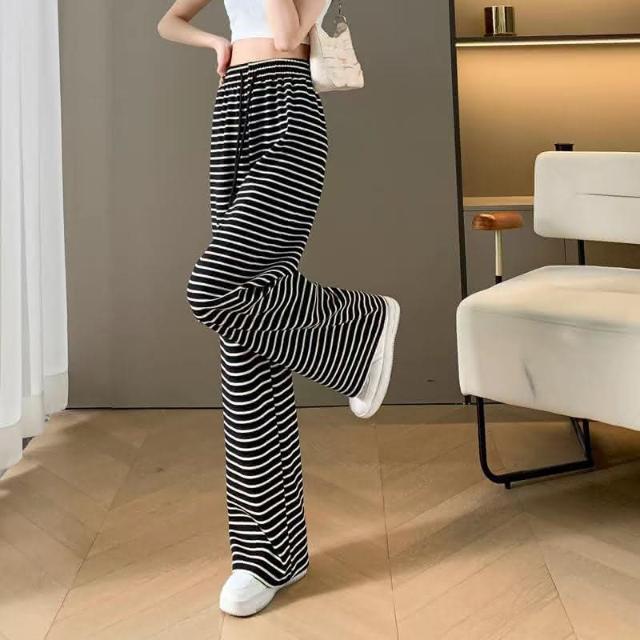 JDUDS黑白條紋闊腿褲 垂感溜灣褲 慵懶風格落地褲 黑白條紋長褲 黑白條紋寬鬆褲 綁繩褲 女生長褲