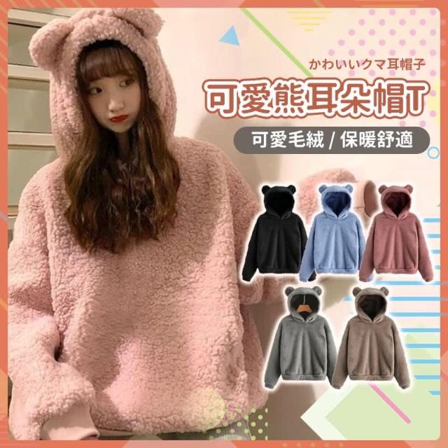 JDUDS可愛毛絨小熊耳朵 毛絨帽T 毛絨上衣 毛絨絨帽T 可愛熊耳朵帽t 秋冬上衣 毛毛帽T 女帽T