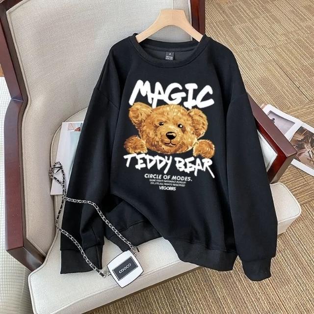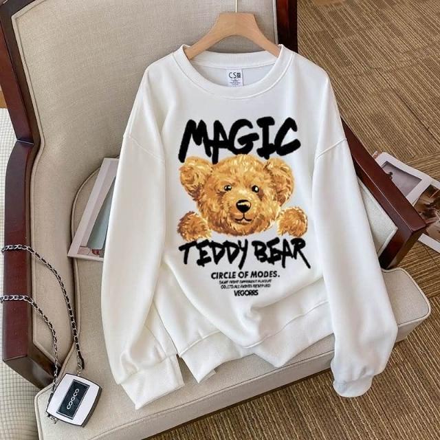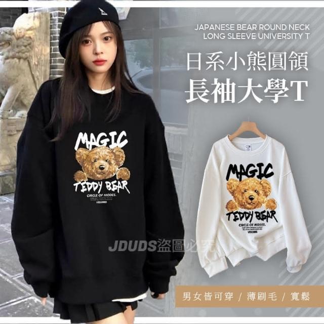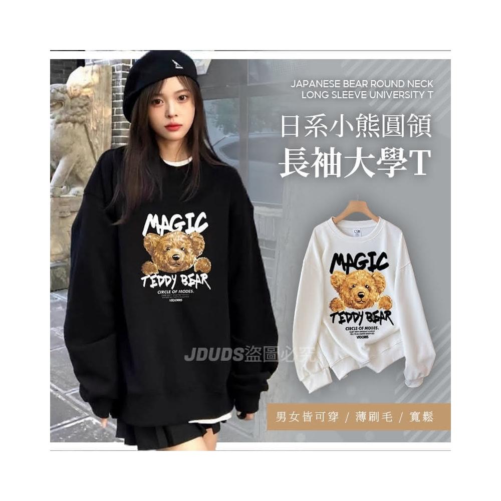 JDUDS日系小熊圓領長袖大學T 男女皆可穿 寬鬆大尺碼上衣 熊熊大學T 薄刷毛大學T 長袖上衣