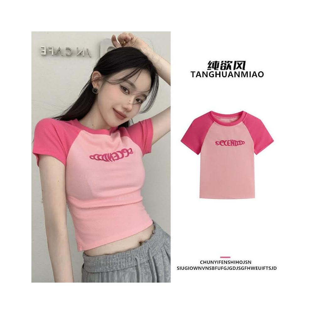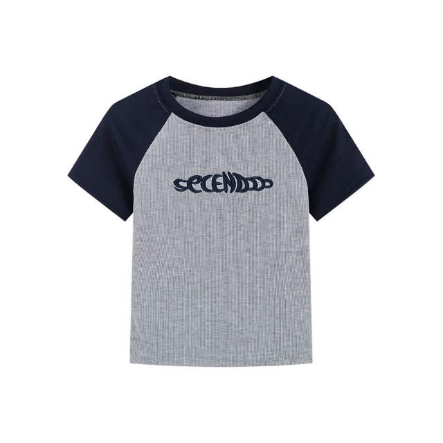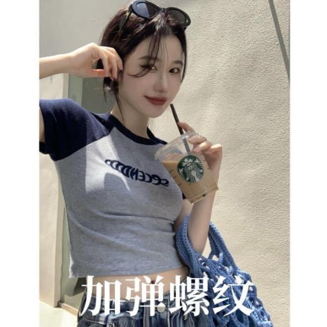 JDUDS拼色短版字母修身露肚上衣 辣妹風短袖 純慾感 合身字母刺繡上衣 顯瘦上衣 女生上衣