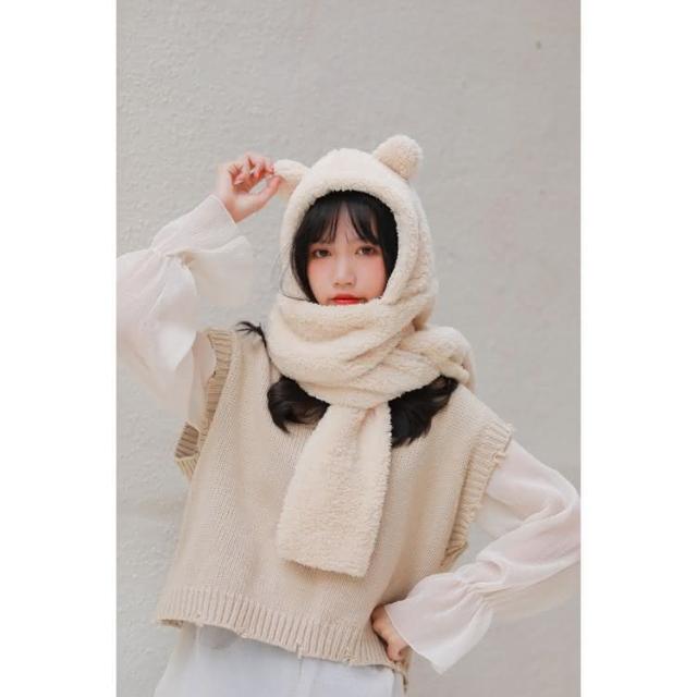 JDUDS小熊帽子圍巾 連帽小熊圍巾可愛百搭毛絨圍巾 加厚絨毛圍巾 秋冬保暖圍巾圍脖 泰迪熊純色圍巾 熊寶寶圍巾