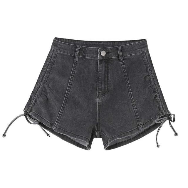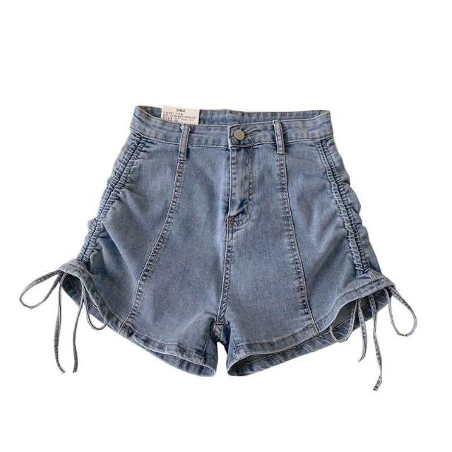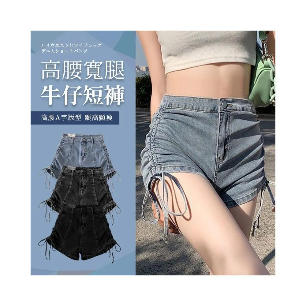 JDUDS抽繩設計感A字绑帶闊腿顯瘦熱褲 高腰牛仔短褲女 抓皺褲 夏裝下著 休閒褲 女牛仔短褲