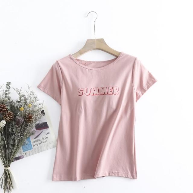 JDUDS棉質英文印花一體式Bra上衣 自帶胸墊免穿內衣 居家短袖上衣 女上衣 短袖上衣 胸墊上衣