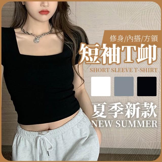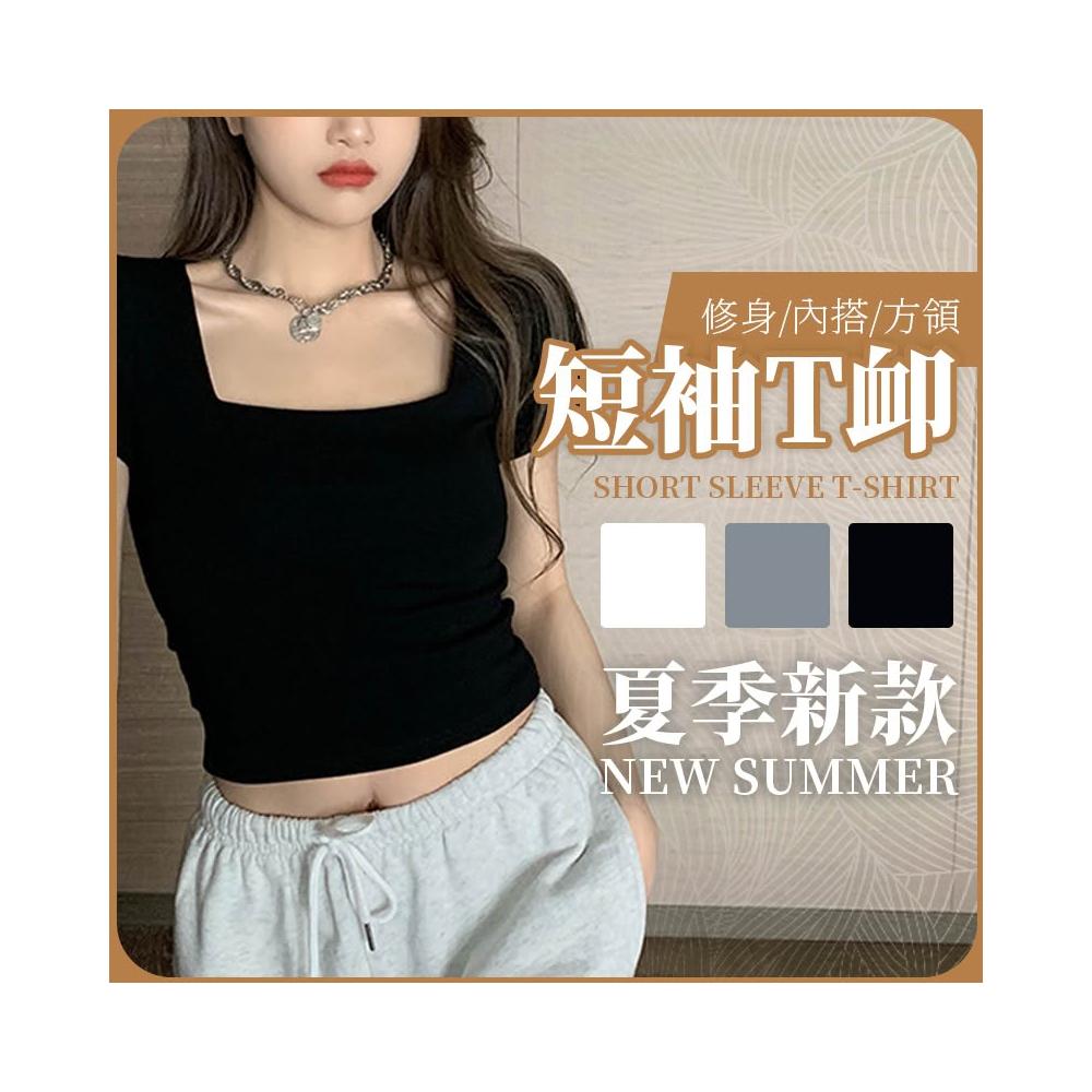 JDUDS夏季方領修身顯瘦短袖T恤 性感短版露肚臍上衣 短版上衣 女生上衣 韓系短袖上衣