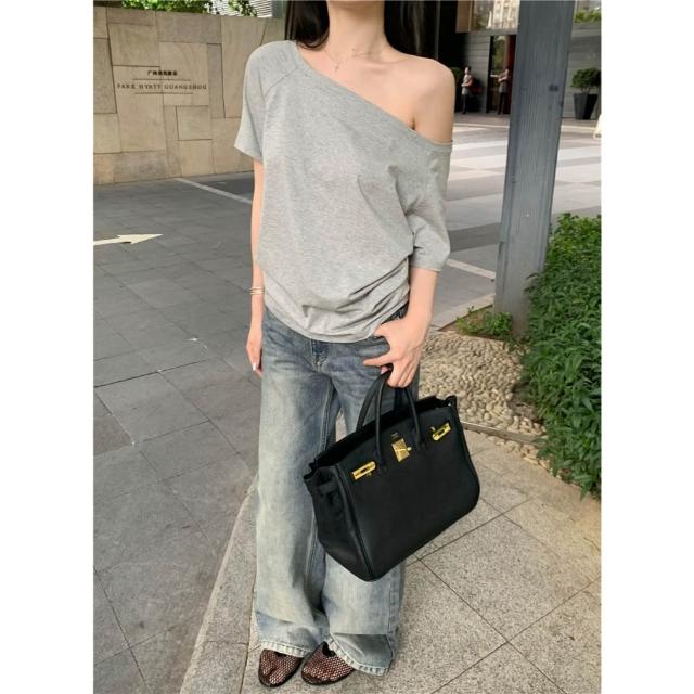 JDUDS辣妹斜肩一字領短袖寬鬆T恤 一字領上衣 純色上衣 寬鬆上衣 女生短袖上衣 女T恤 露肩上衣