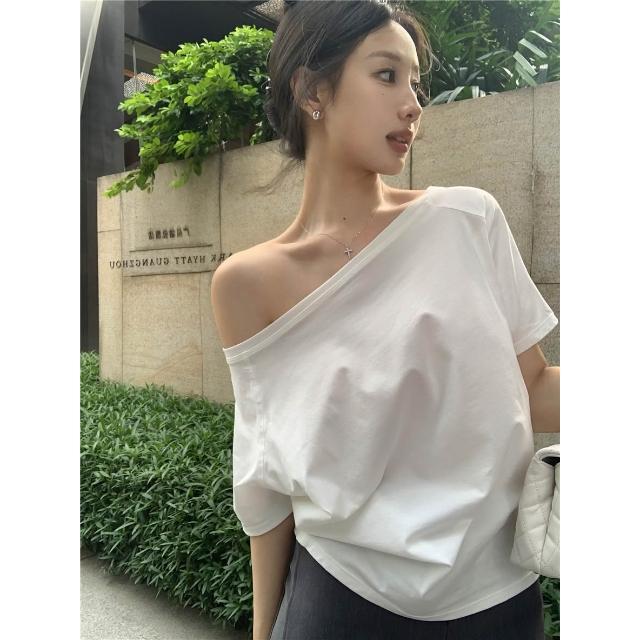 JDUDS辣妹斜肩一字領短袖寬鬆T恤 一字領上衣 純色上衣 寬鬆上衣 女生短袖上衣 女T恤 露肩上衣