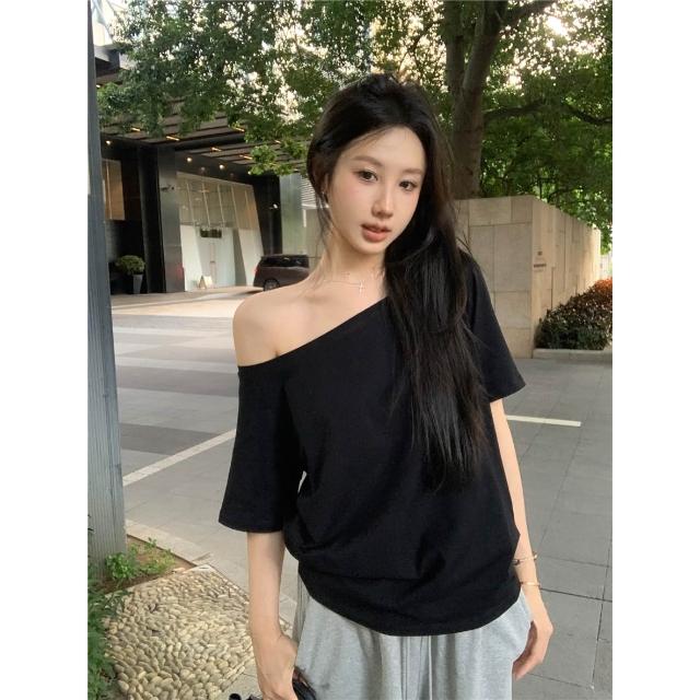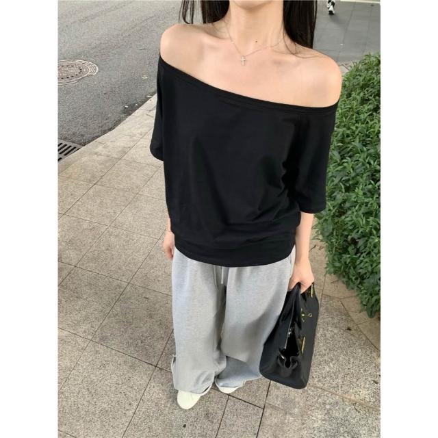 JDUDS辣妹斜肩一字領短袖寬鬆T恤 一字領上衣 純色上衣 寬鬆上衣 女生短袖上衣 女T恤 露肩上衣