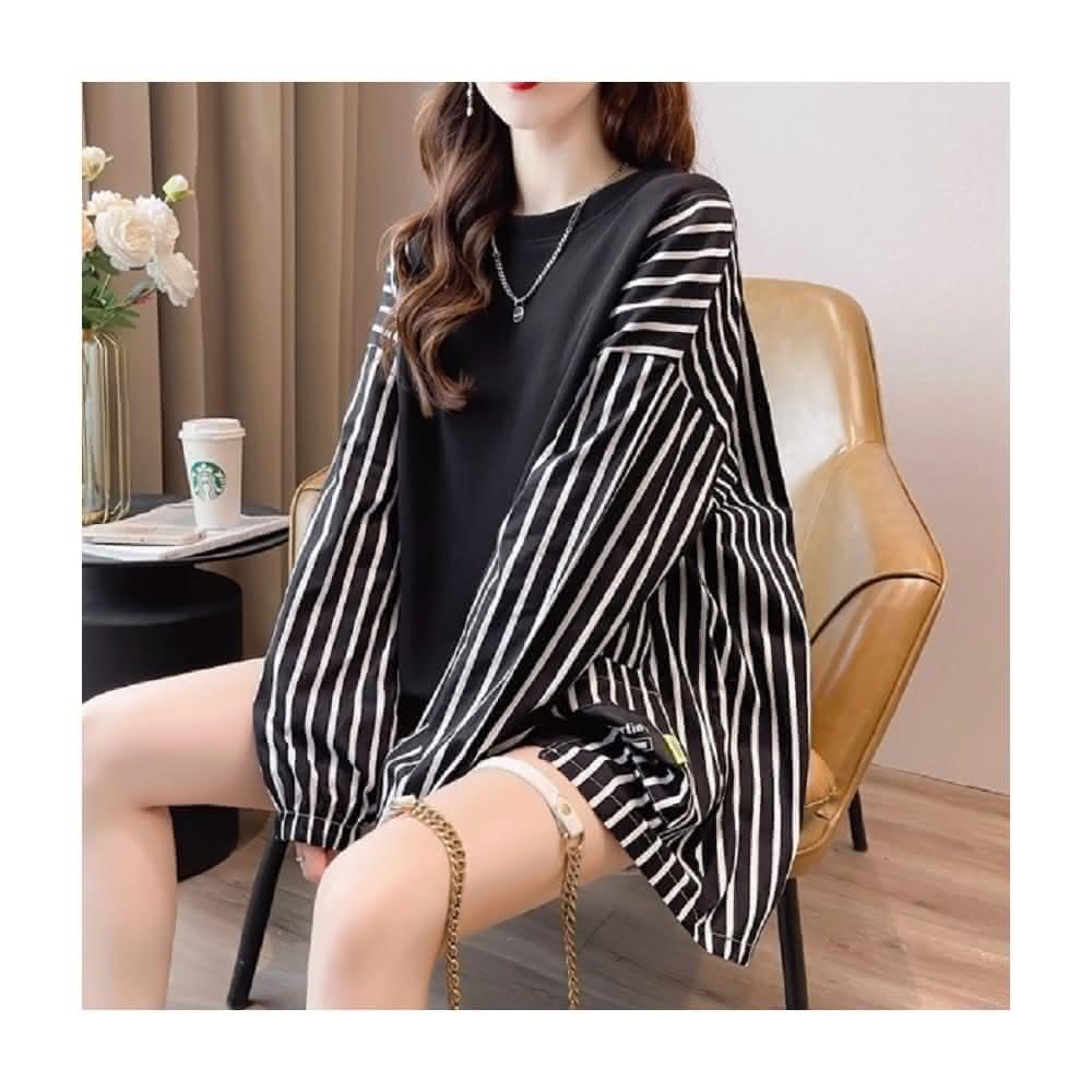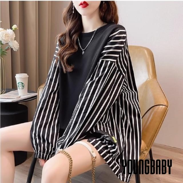 YOUNGBABY圓領撞色拼接條紋大口袋布標T 中大尺碼女裝