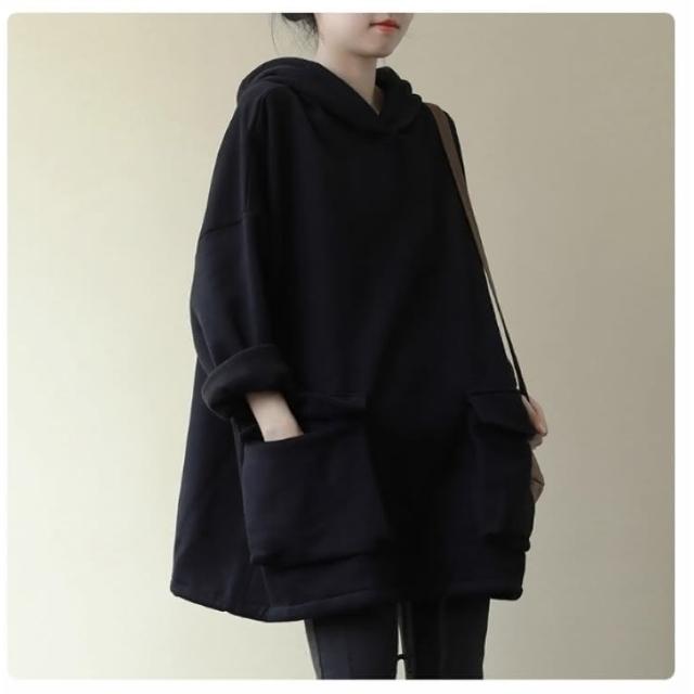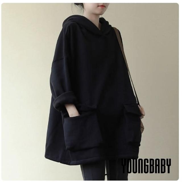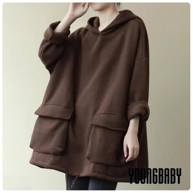YOUNGBABY大大口袋純色連帽加厚加絨寬鬆T 中大尺碼女裝