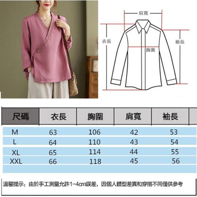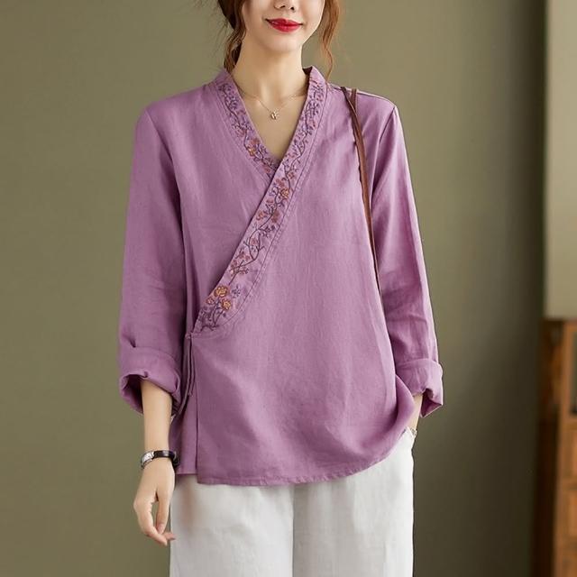 Paiya 派亞長袖棉麻上衣刺繡襯衫女V領中式盤扣茶服M-2XL寬鬆顯瘦遮小腹