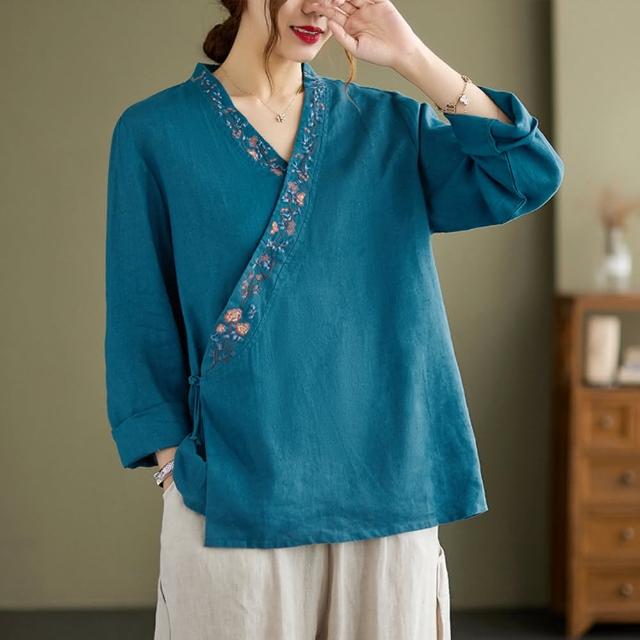 Paiya 派亞長袖棉麻上衣刺繡襯衫女V領中式盤扣茶服M-2XL寬鬆顯瘦遮小腹