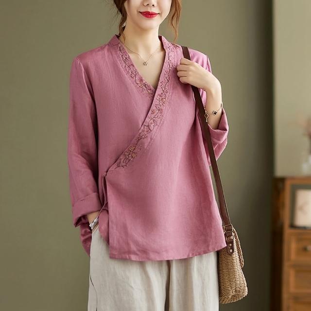 Paiya 派亞長袖棉麻上衣刺繡襯衫女V領中式盤扣茶服M-2XL寬鬆顯瘦遮小腹