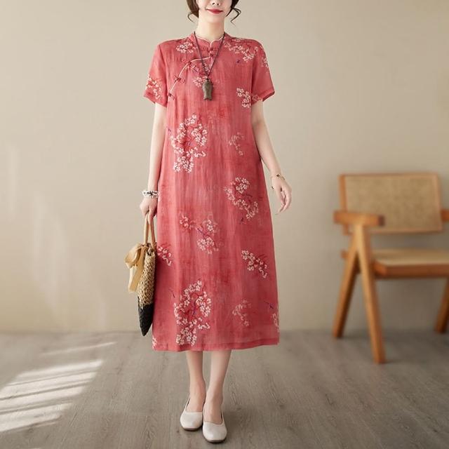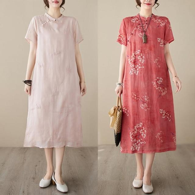 Paiya 派亞新款民國風棉麻刺繡短袖改良旗袍中長裙宴會休閒M-3XL