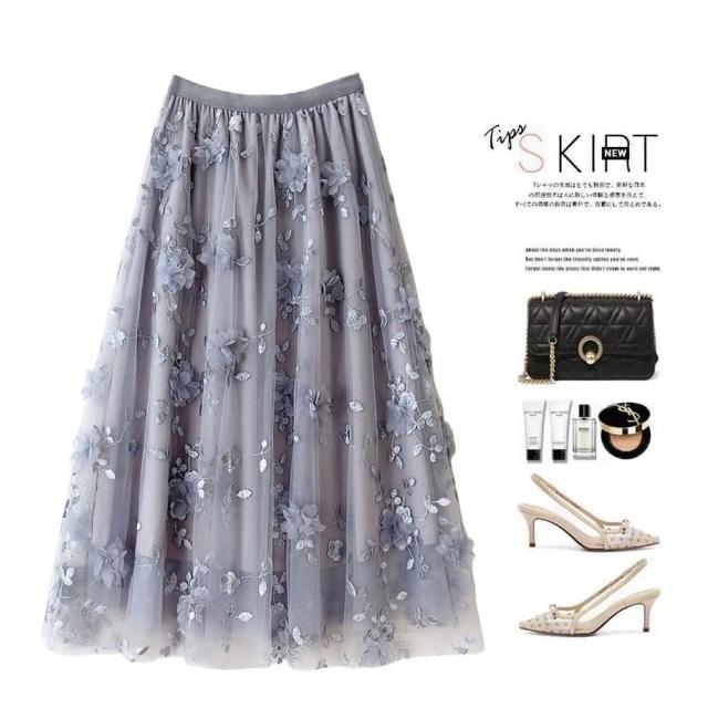 Paiya 派亞傘裙網紗刺繡半身裙溫柔氣質中長裙子立體花朵重工紗裙小清新仙女裙