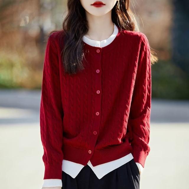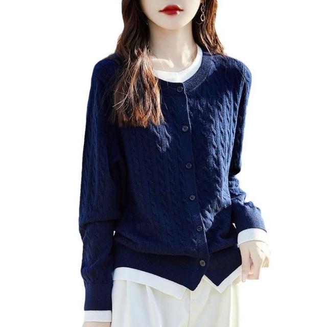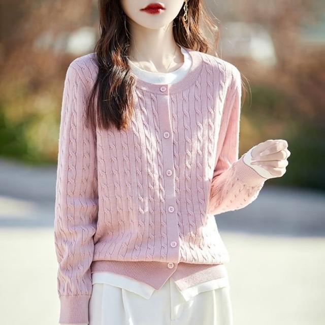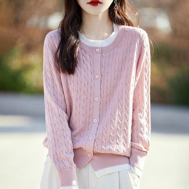 Paiya 派亞圓領拼色假兩件開衫女式秋冬新款寬松麻花毛衣外套針織衫上衣40-67.5kg可穿