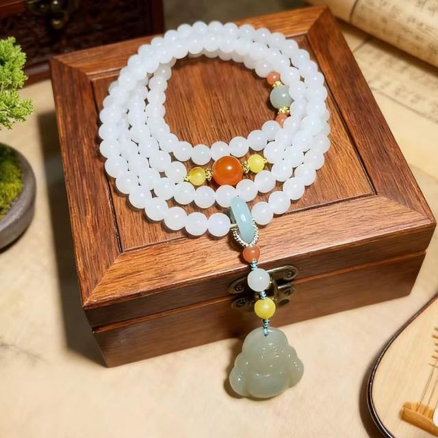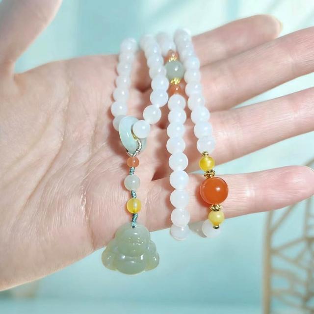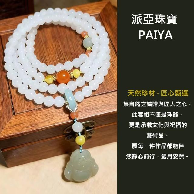 Paiya 派亞原創設計6mm天然和田玉白玉翡翠南紅瑪瑙琥珀項鏈帶油青佛公吊墜四圈手鏈