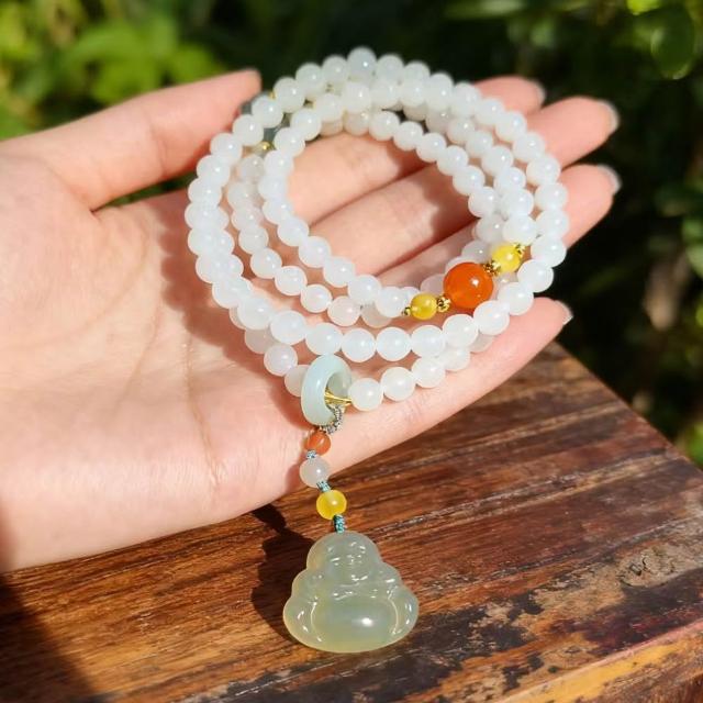 Paiya 派亞原創設計6mm天然和田玉白玉翡翠南紅瑪瑙琥珀項鏈帶油青佛公吊墜四圈手鏈