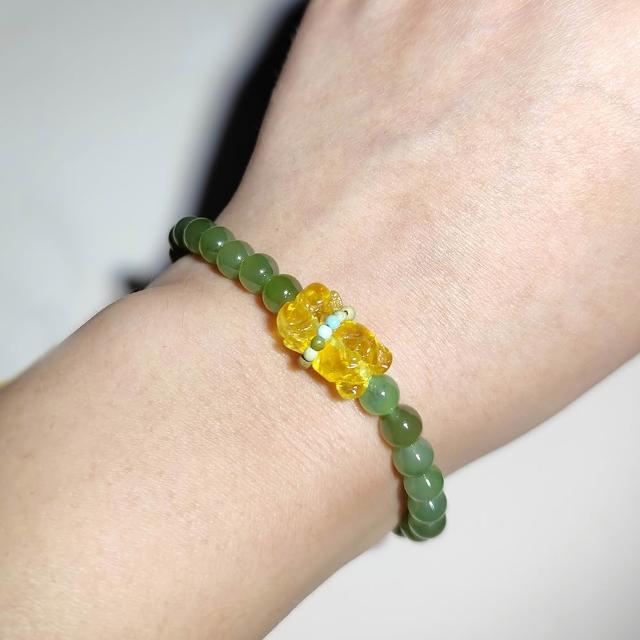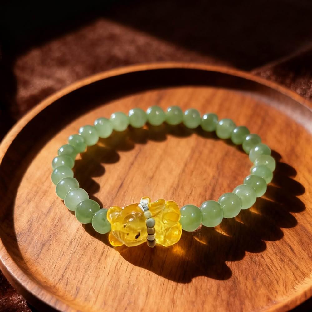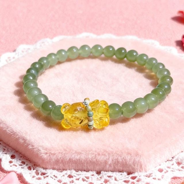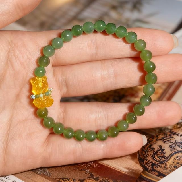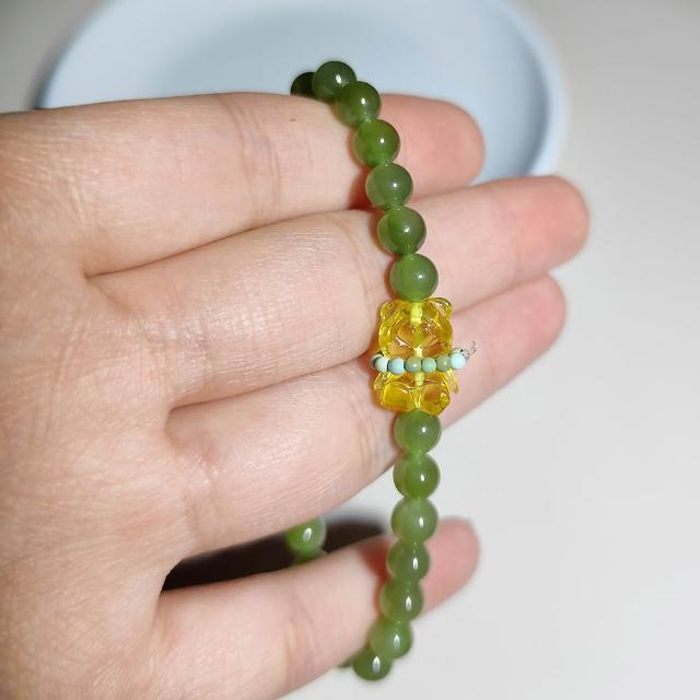 Paiya 派亞《小熊的寶藏》|6MM蘋果綠天然和田玉碧玉・金珀・綠松石 編織童趣手串