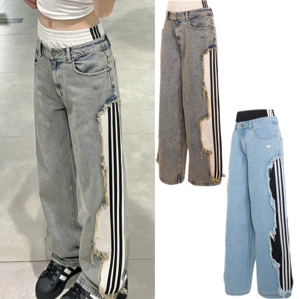 adidas 愛迪達ADIDAS ORIGINALS ADILENIUM 破壞感 牛仔寬褲 假兩件 褲頭 高腰 愛迪達 KY5192/KY5