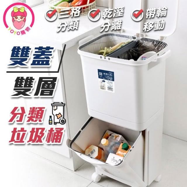 日式雙蓋雙層分類垃圾桶(垃圾桶 干濕分離 回收桶 大號垃圾桶 拉圾筒 廚房收納 廚房用品 廚餘桶 00888)