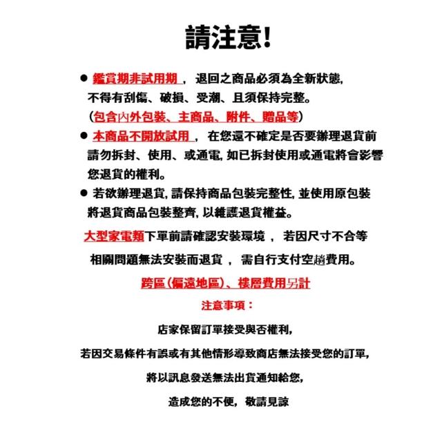 • 商品到貨享十天猶豫期之權益(注意!猶豫期非試用期),依法辦理退貨商品必須是全新狀態且包裝完整(包含主機、附件、內外包裝、隨機文件、贈品等)。如商品一經拆封或使用致商品價值受損(例僅得以福利品出售),商店將向消費者就商品一部或全部價值減損收取適當之費用(回復原狀、整新費),否則將影響退貨的權限。請先確認商品正確、外觀可接受,再行開機/使用,以免影響您的權利,祝您購物順心。