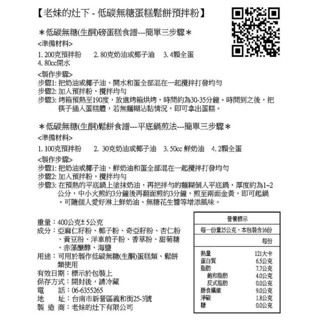 老妹的灶下無麵粉無加糖蛋糕餅預拌粉減醣(無麵粉無加糖蛋糕鬆餅預拌粉減醣)