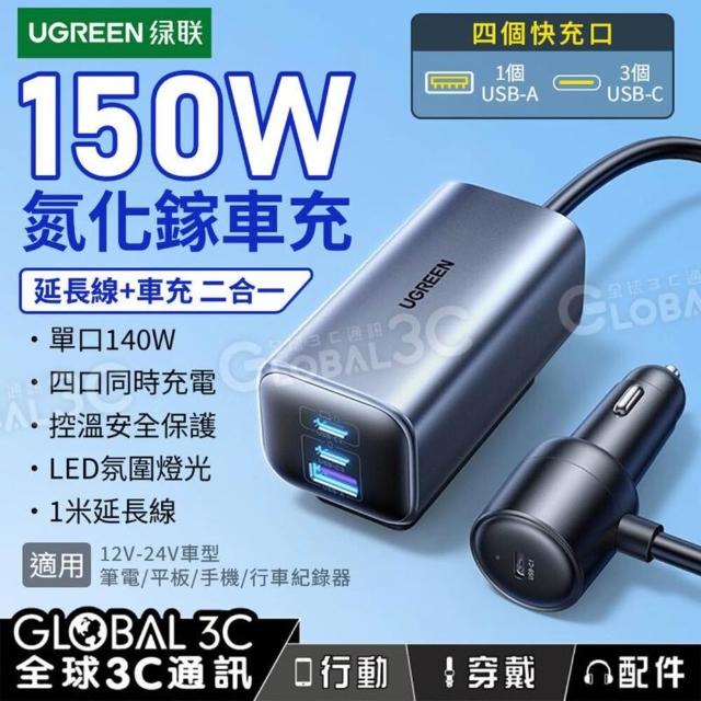 綠聯 150W車充+延長線二合一 前後座充 車氮化鎵GaN快充 4個輸出口 單口140W 安全控溫