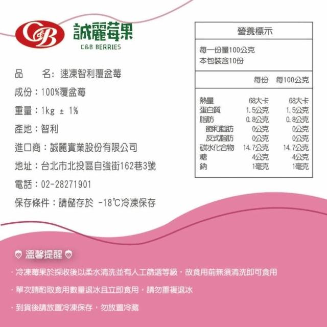 誠麗莓果IQF急速冷凍覆盆莓(智利產地酸甜口感果肉扎實1000克/包)