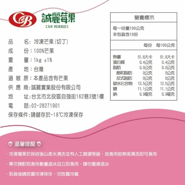 誠麗莓果IQF急速冷凍芒果丁(台灣屏東愛文品種 500g/包)