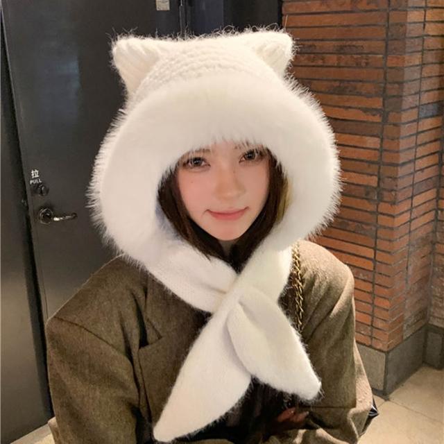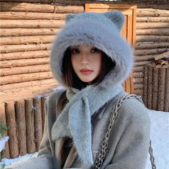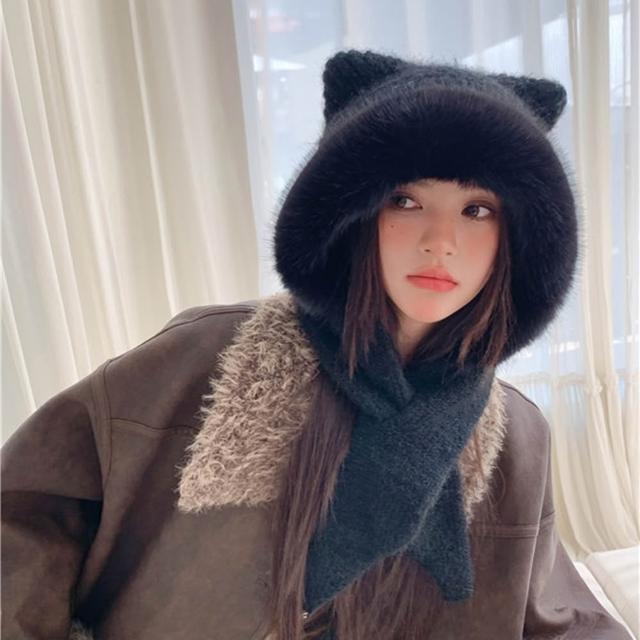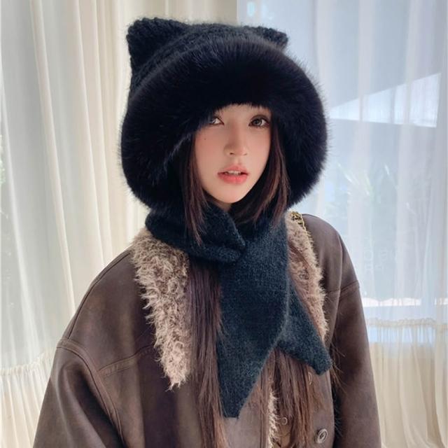 法式貓耳暖冬圍巾毛帽