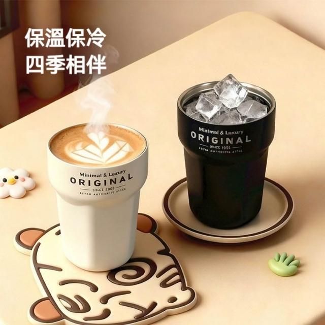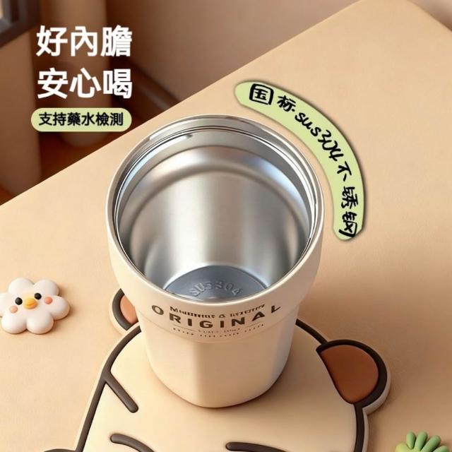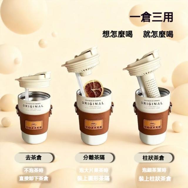 斜背咖啡保溫杯 304不鏽鋼水杯 隨行杯附背帶 吸管直飲兩用 茶倉設計便攜水壺 戶外通勤咖啡杯