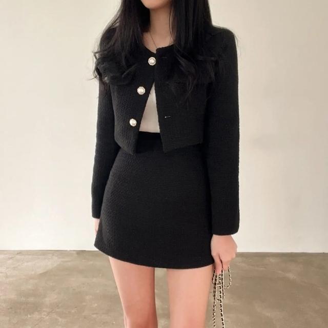 Ying fashion shop春秋新款 韓系chic 法式小香風 珍珠鈕扣 氣質 短款外套+高腰粗花呢包臀半身裙套裝