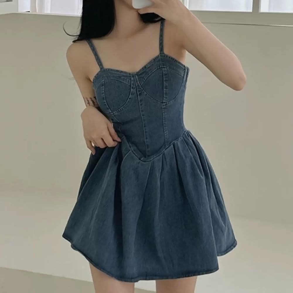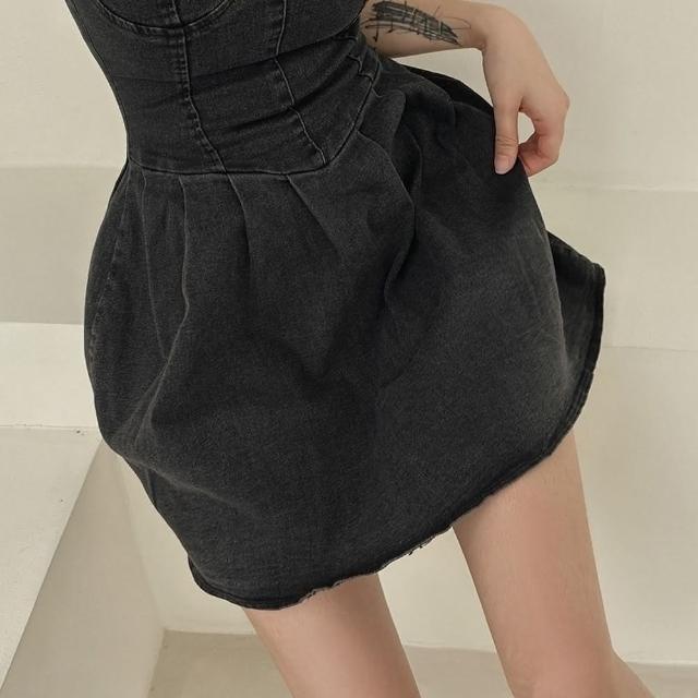 Ying fashion shop復古牛仔吊帶裙 吊帶連衣裙 蓬蓬連衣裙 小個子洋裝 收腰顯瘦 小性感V領短裙