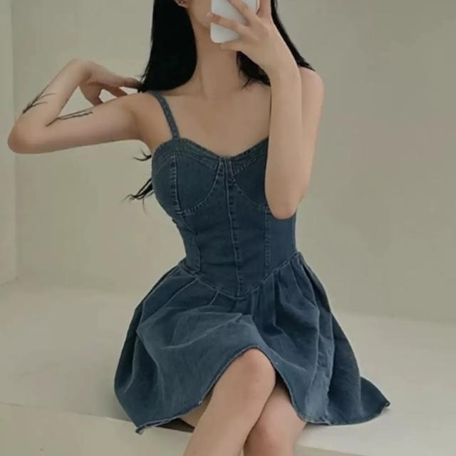 Ying fashion shop復古牛仔吊帶裙 吊帶連衣裙 蓬蓬連衣裙 小個子洋裝 收腰顯瘦 小性感V領短裙