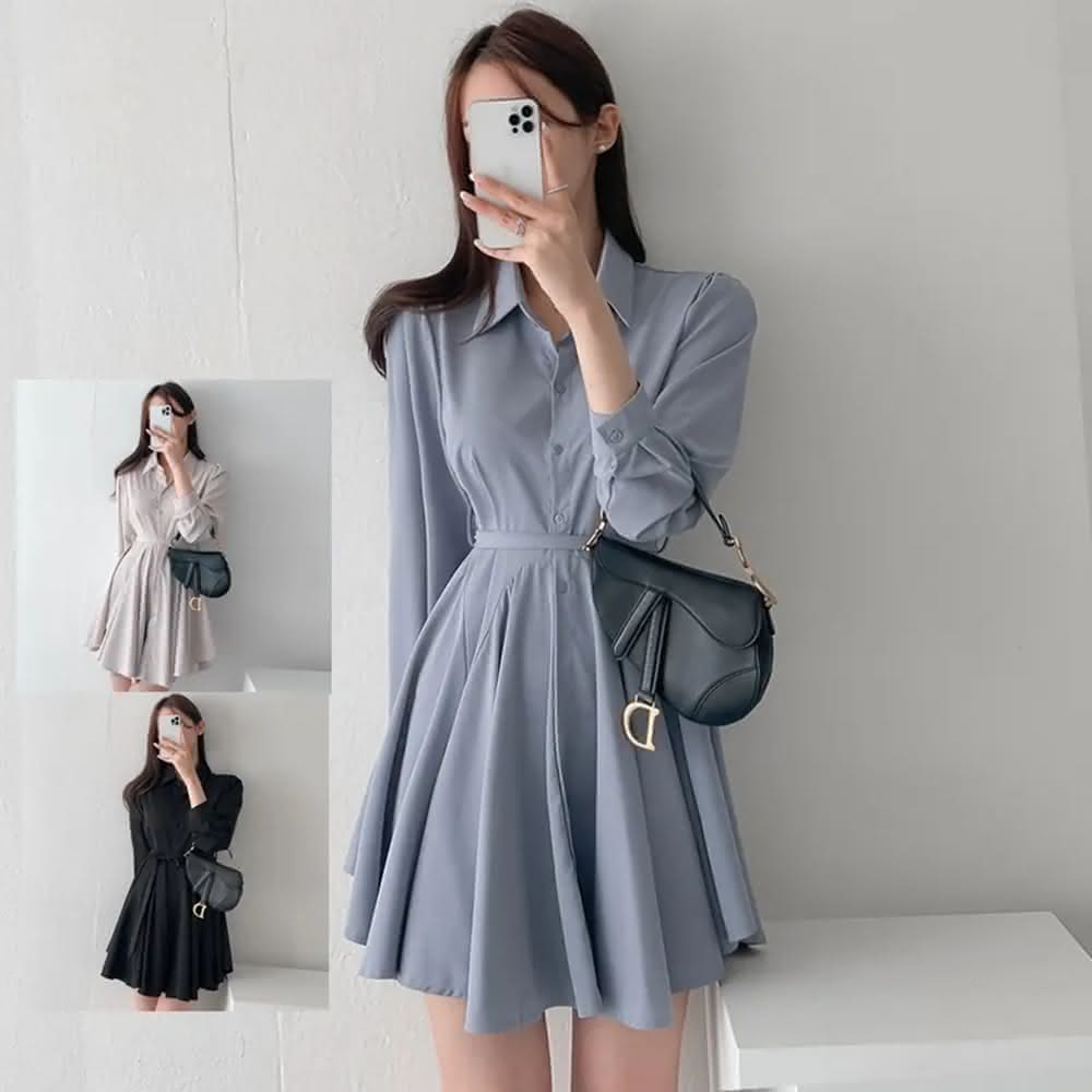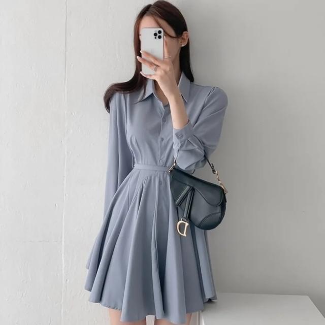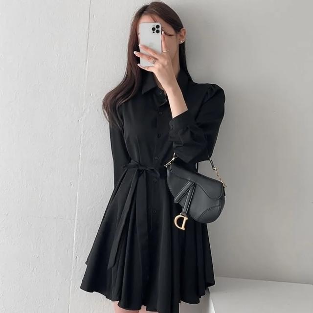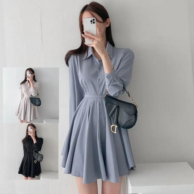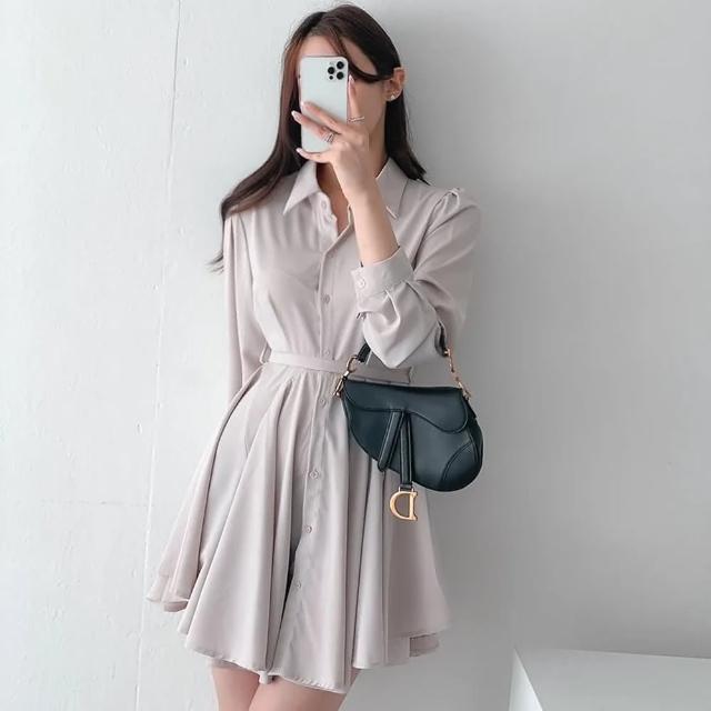 Ying fashion shop韓系chic 春夏氣質洋裝 翻領單排釦 綁帶收腰 長袖百褶連衣裙 A字傘裙 襯衫洋裝