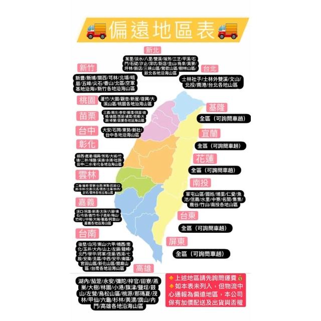 - 針對大型商品(包括:大型家電、家具床墊、健身按摩器材、車類...等),商店將於完成收款確認後,一天內〈不含例假日〉將會有專人與您確認相關配送細節等的聯繫。偏遠地區、樓層費及其它加價費用,皆由商店於約定配送時一併告知,商店將保留出貨與否的權利。