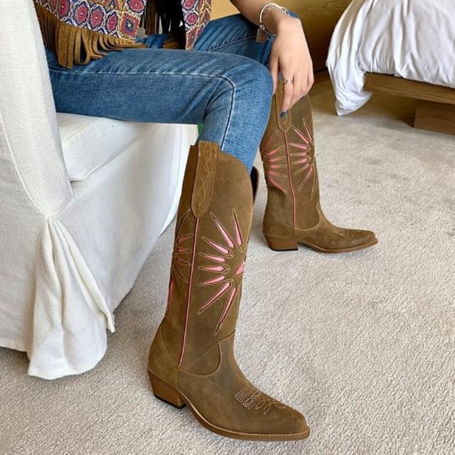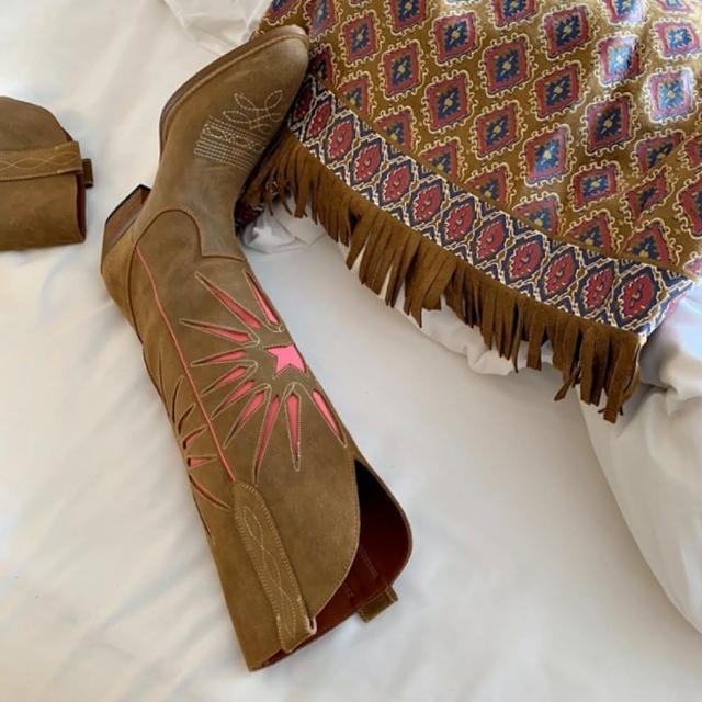 iFOCUS真皮磨砂反牛絨復古尖頭做舊刺繡西部牛仔長筒靴(磨砂皮西部牛仔長筒靴)