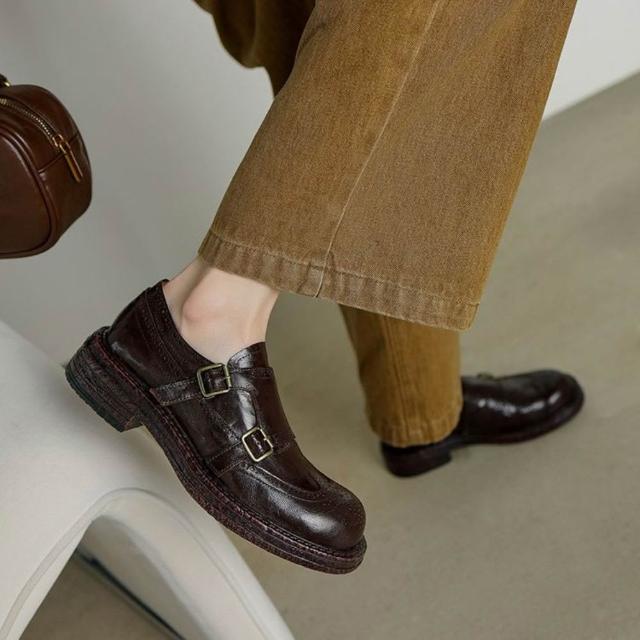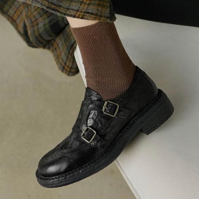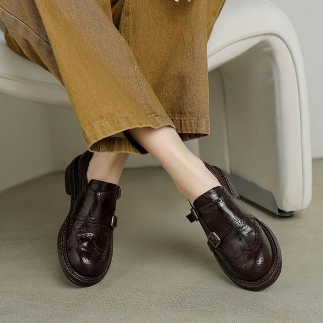 WYPEX圓頭雕花皮帶真皮小皮鞋女鞋樂福鞋牛津鞋