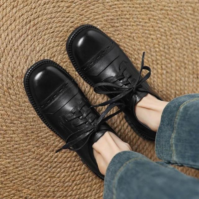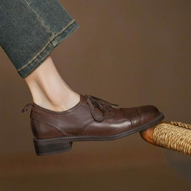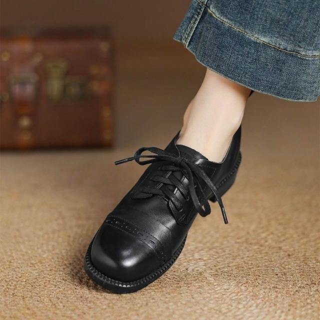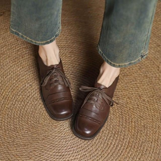 WYPEX英倫方頭真皮小皮鞋女鞋 綁帶低跟牛津鞋