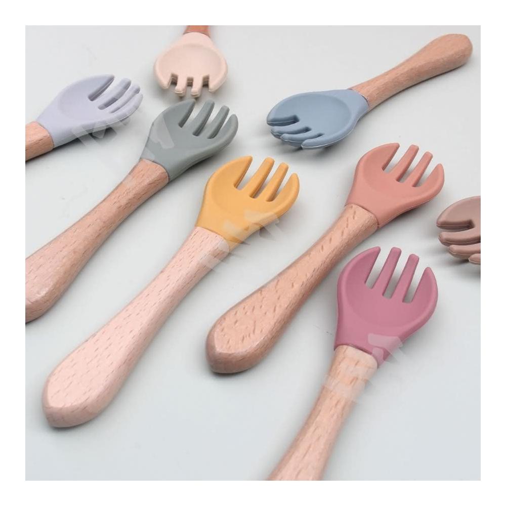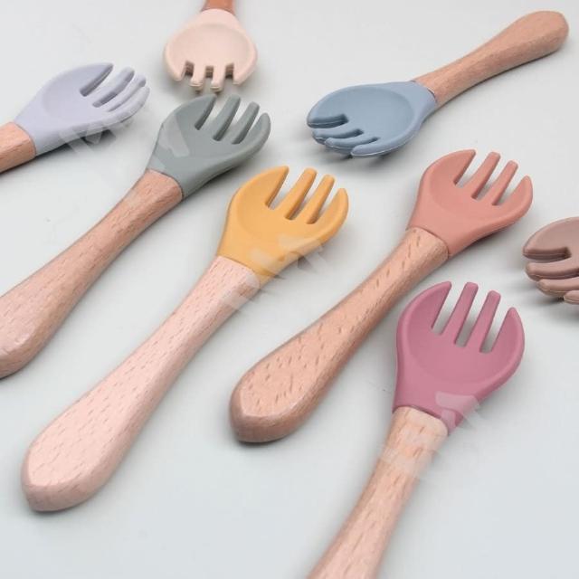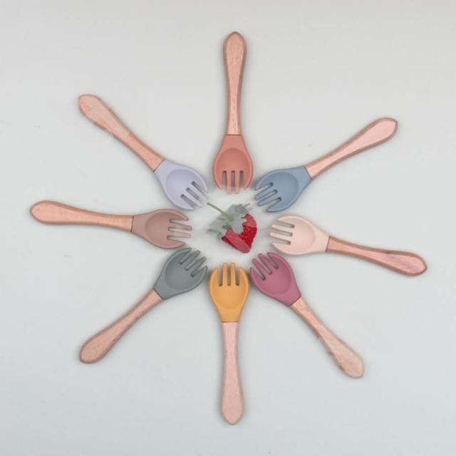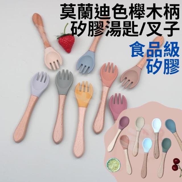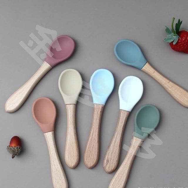 兒童餐具 寶寶餐具 兒童湯匙 莫蘭迪色櫸木柄矽膠湯匙 兒童學習餐具 寶寶學習餐具
