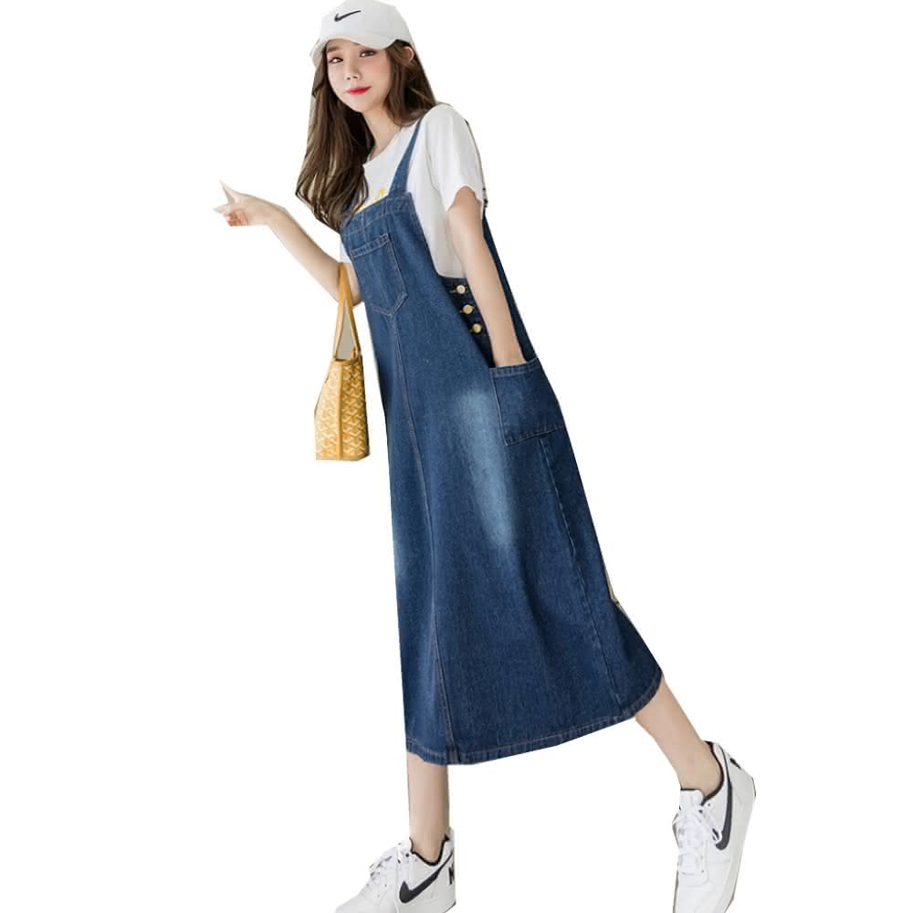 CHACO/現+預購/女深藍色中大碼簡約刷白吊帶牛仔長版連身裙洋裝#3665(牛仔 連身裙 吊帶 背心 單寧 女裝 四季)