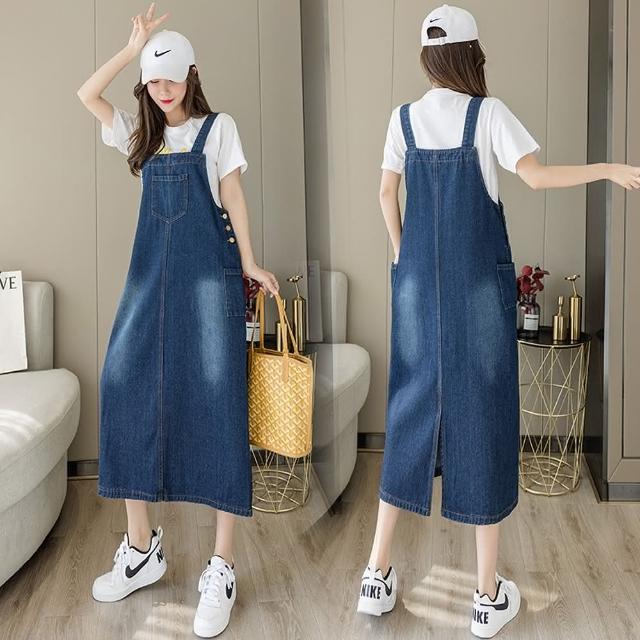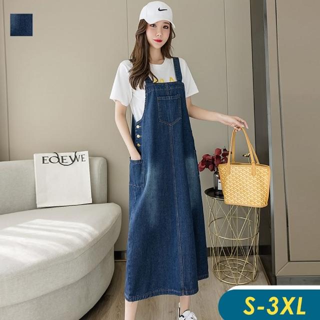 CHACO/現+預購/女深藍色中大碼簡約刷白吊帶牛仔長版連身裙洋裝#3665(牛仔 連身裙 吊帶 背心 單寧 女裝 四季)