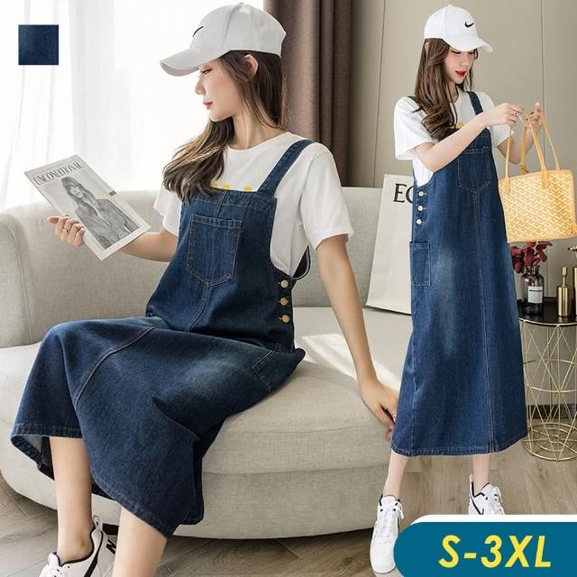 CHACO/現+預購/女深藍色中大碼簡約刷白吊帶牛仔長版連身裙洋裝#3665(牛仔 連身裙 吊帶 背心 單寧 女裝 四季)