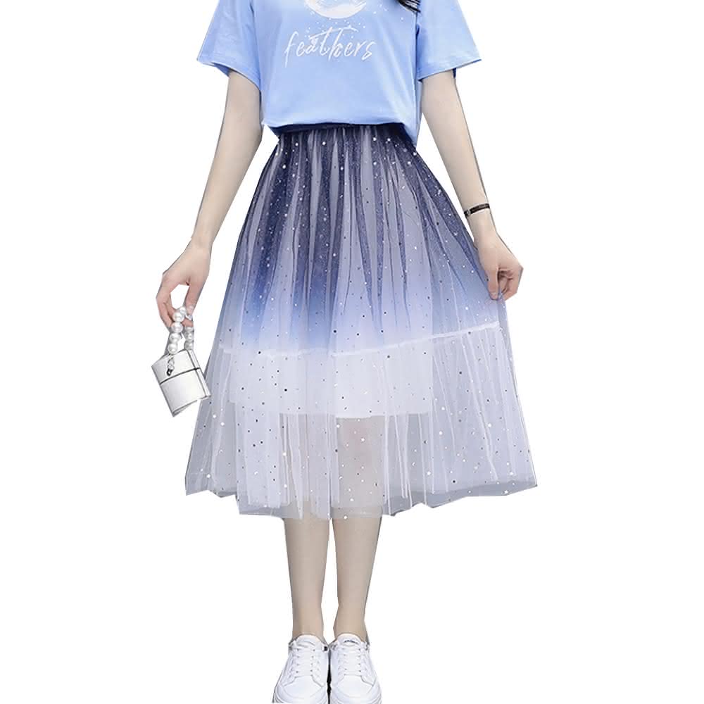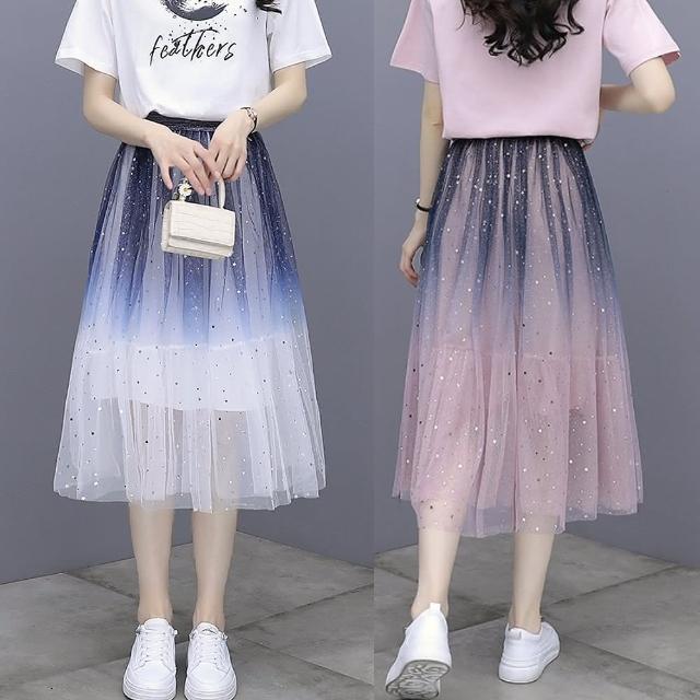 CHACO/現+預購/女 漸變色亮片星星仙女網紗裙半身長裙#8170(網紗 半身裙 長裙 亮片 女 春夏秋)