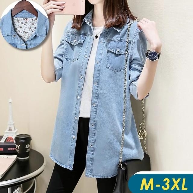 CHACO/現+預購/女春秋亮眼碎花學院風長袖牛仔襯衫外套#9771 深藍(牛仔 單寧 襯衫 外套 學院風 女)