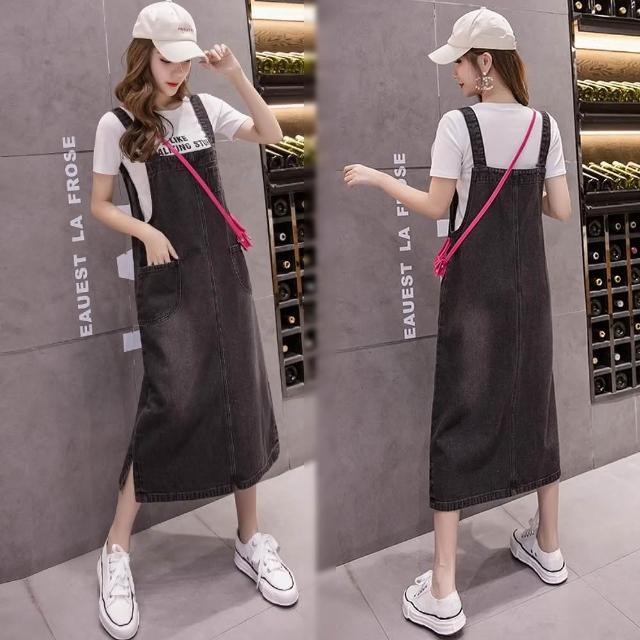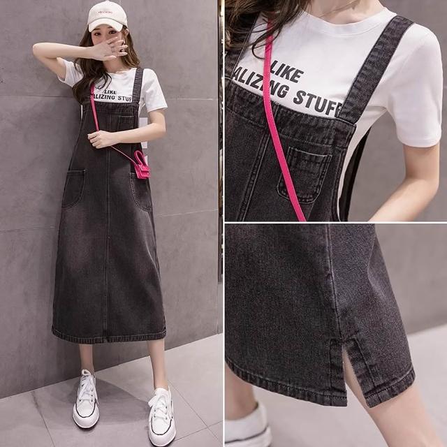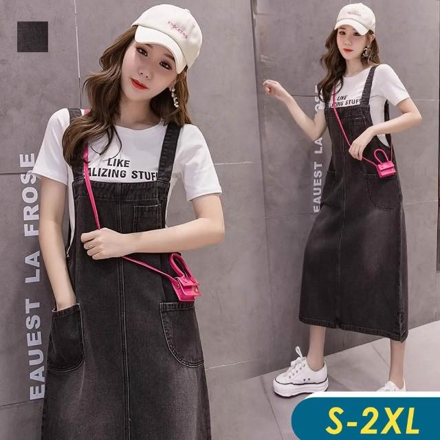 CHACO/現+預購/女 黑色四季百搭簡約刷白吊帶牛仔長版連身裙洋裝#3615(吊帶 牛仔 連身裙 黑色 女 四季)