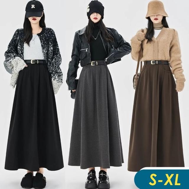 CHACO/預購/女冬日 毛呢半身裙美拉德風高腰有口袋厚感長裙+皮帶#1788(半身裙 長裙 毛呢 美拉德)