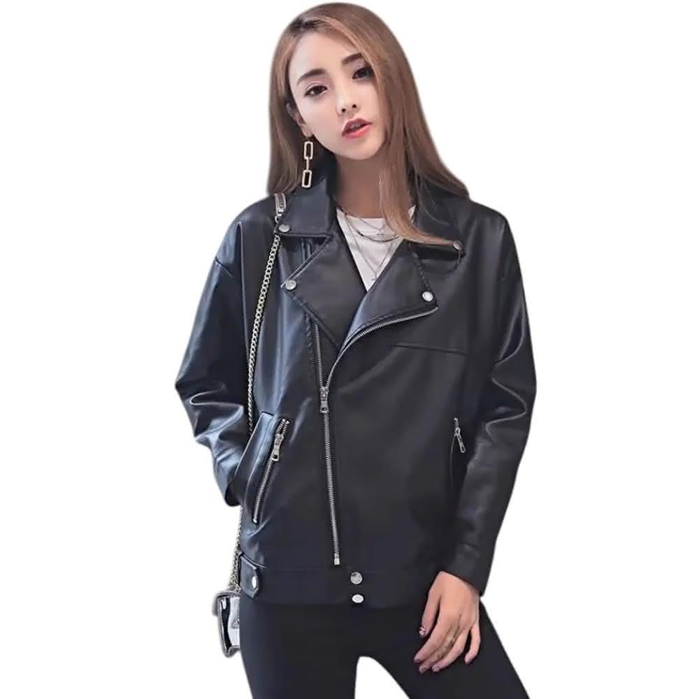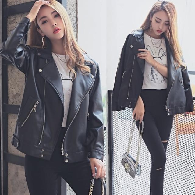 CHACO/預購/女春秋 黑色皮衣oversize男孩風落肩寬鬆短版外套#py08(女皮衣 女外套 夾克 春秋 男孩風)