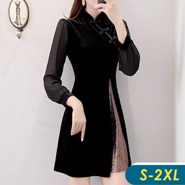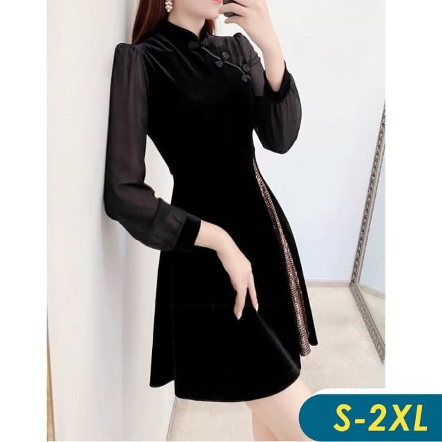 CHACO/現+預購/女秋冬 黑色復古風質感金絲絨改良式旗袍長袖連身裙洋裝#1873(絲絨 旗袍 連身裙 黑裙 洋裝 派對)